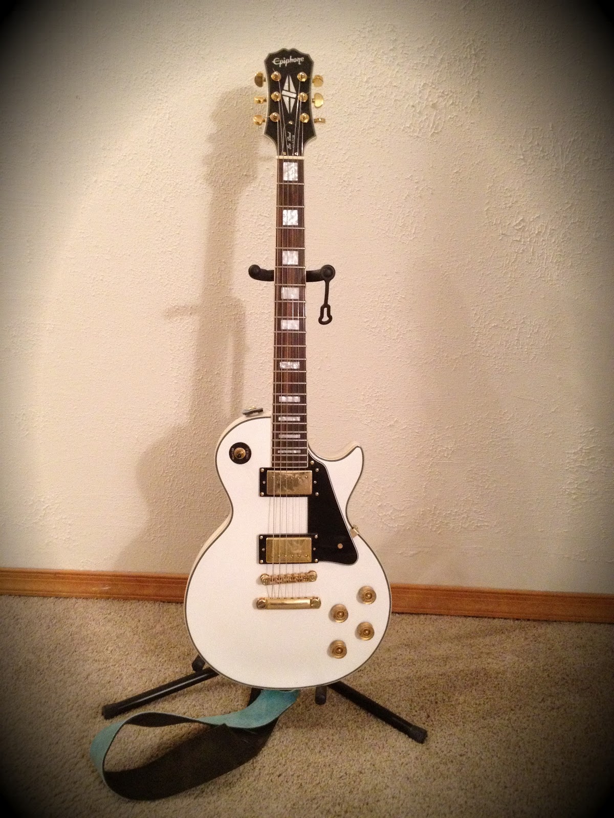So I decided to go out to Guitar Center Saturday morning and plunk down the $449 for the MIM.  I walked in the front door, and what was the very first thing I saw? Something else that was on my Wish List, a beautiful Epiphone Les Paul Custom, Alpine White with gold hardware. Generally retails for $800, but this one was used and marked down to…yes, $600.